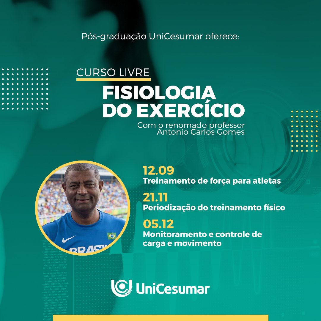 Com o objetivo de levar conhecimento a alunos, professores, profissionais do mercado e comunidade externa, a pós-graduação da UniCesumar promoverá o curso livre “Fisiologia do Exercício”, ministrado pelo professor Dr. Antônio Carlos Gomes, que tem como foco estudantes e profissionais das áreas de Educação Física, Fisioterapia, Medicina e Nutrição. A primeira aula está marcada para este sábado (12), enquanto as outras duas ocorrerão nos dias 21 de novembro e 5 de dezembro, todas de forma virtual por meio da plataforma Google Meet.